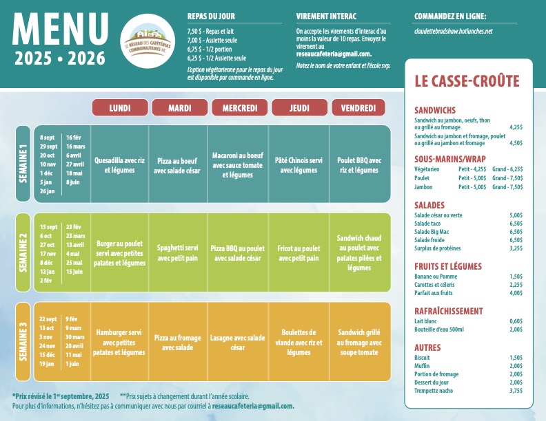 Menu de la cafétéria